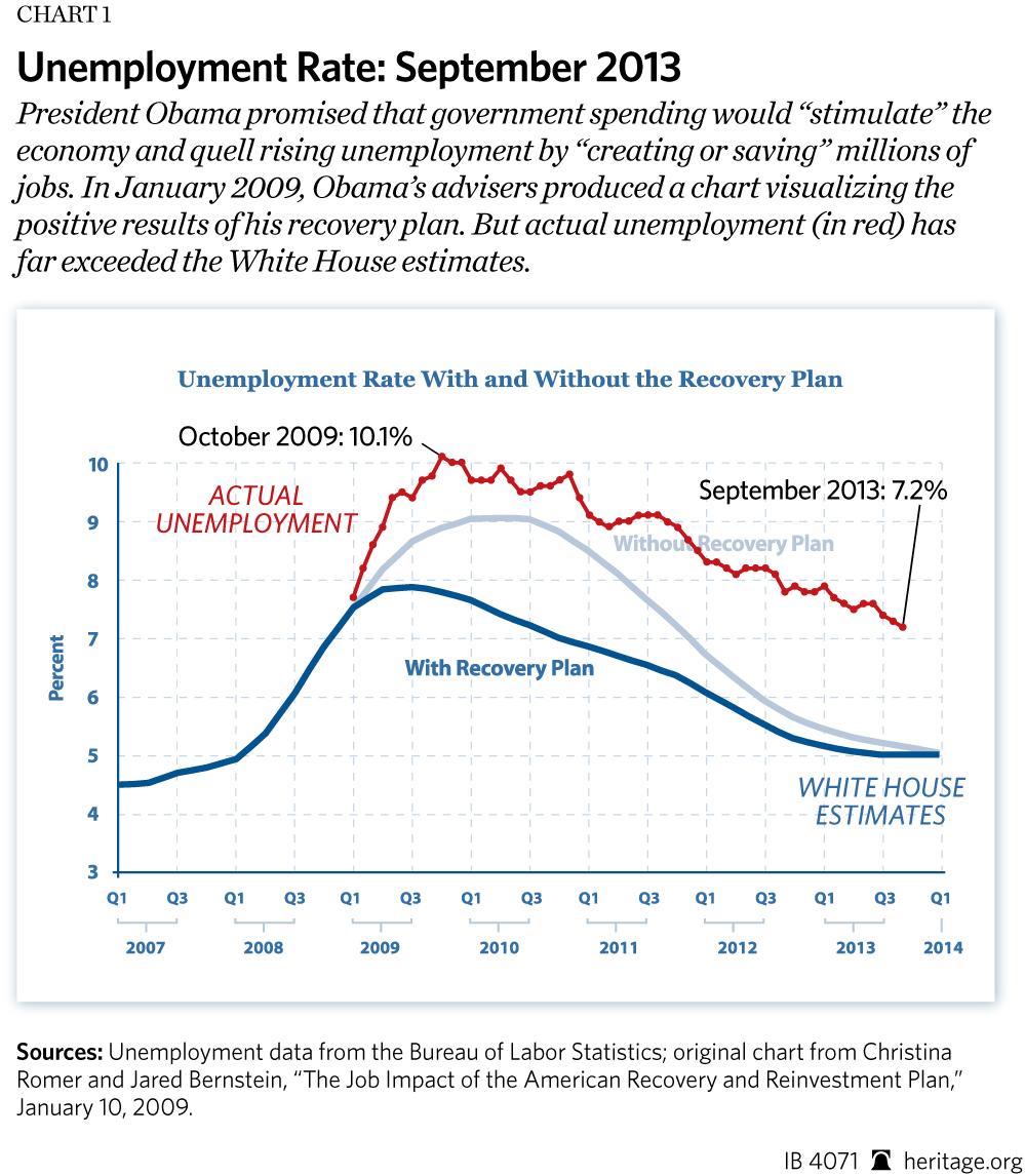 President Obama promised that government spending would “stimulate” the economy and quell rising unemployment by “creating or saving” millions of jobs. In January 2009, Obama’s advisers produced a chart visualizing the positive results of his recovery plan. But actual unemployment (in red) has far exceeded the White House estimates.