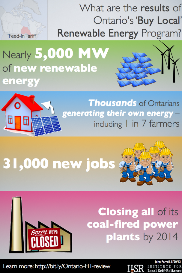 Ontario’s clean energy program encourages local ownership and distributed generation, in part to broaden support for renewable energy and in part to capture the increased economic impact generated from local ownership.