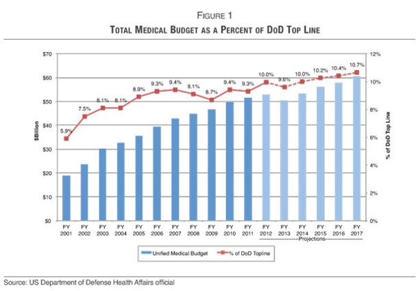 The Defense Department’s total medical costs have more than doubled, from $19 billion in fiscal year 2001 to $48.7 billion for fiscal year 2013. Growing faster than the department's overall budget, these costs now make up close to 10 percent of the total budget, whereas they represented only 5.9 percent of the total back in FY 2001.