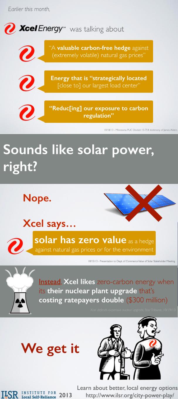 This infographic describes how monopoly utility Xcel Energy has two different messages on low-carbon energy, depending on the audience. Do they like customer-owned solar or their own nuclear power plant best? I'll bet you already know the answer.