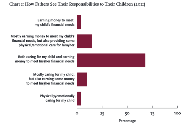 A significant majority of the fathers see their responsibilities to their children as both caring for them and earning money to support them, suggesting that traditional bread-winning responsibilities are combined with care-giving responsibilities in the images of what it means to be a father today.