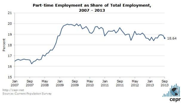 Since peaking a few months after the start of the Recession, the percentage of the workforce employed part-time has been modestly, but steadily, declining. It is still nearly 2% over the pre-Recession percentage.