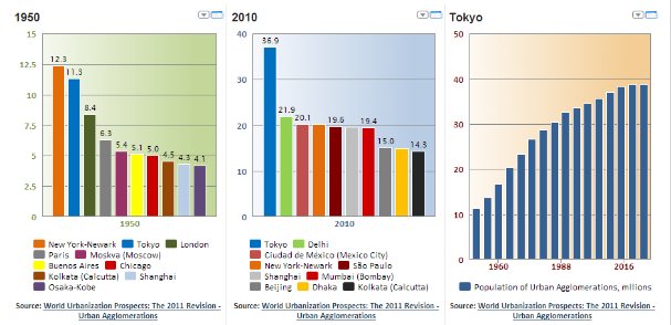 Only 4 cities from the former top 10 stay there 60 years later. Population of Tokyo reached almost 37 millions in 2010 and now it's the largest urban agglomeration.