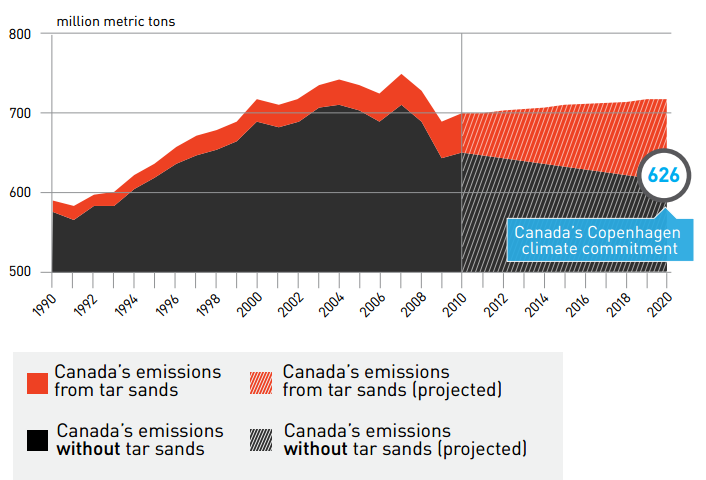 Growing tar sands emissions are keeping Canada from meeting its climate commitments.Rapidly increasing greenhouse gas emissions from tar sands account for nearly the entire significant gap between Canada’s most recent climate commitment in Copenhagen and the emissions it expects in 2020.