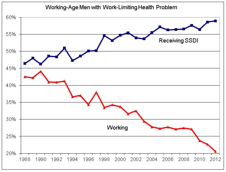 Data compiled from the Current Population Survey on men aged 20 to 59 with a work-limiting health problem shows that the percentage of these men receiving social security disability insurance and leaving work has been increasing, while the percentage of men working with a limiting health problem has been decreasing.
