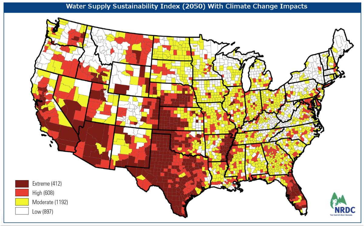 If climate change continues unhindered, the nation will face significant water shortage issues by mid-century. More than 1,100 counties will face high risk of water shortages, with shortages most acute in the southwest.