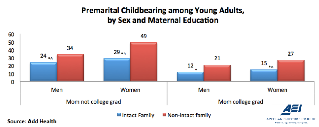 Families in which the mother earned a college degree are more likely to remain intact and less likely to have children at a young age. The intact, two-parent family seems to be particularly important for children hailing from less privileged homes and a powerful force for economic mobility. See also: savvyroo.com/chart-3572567677…