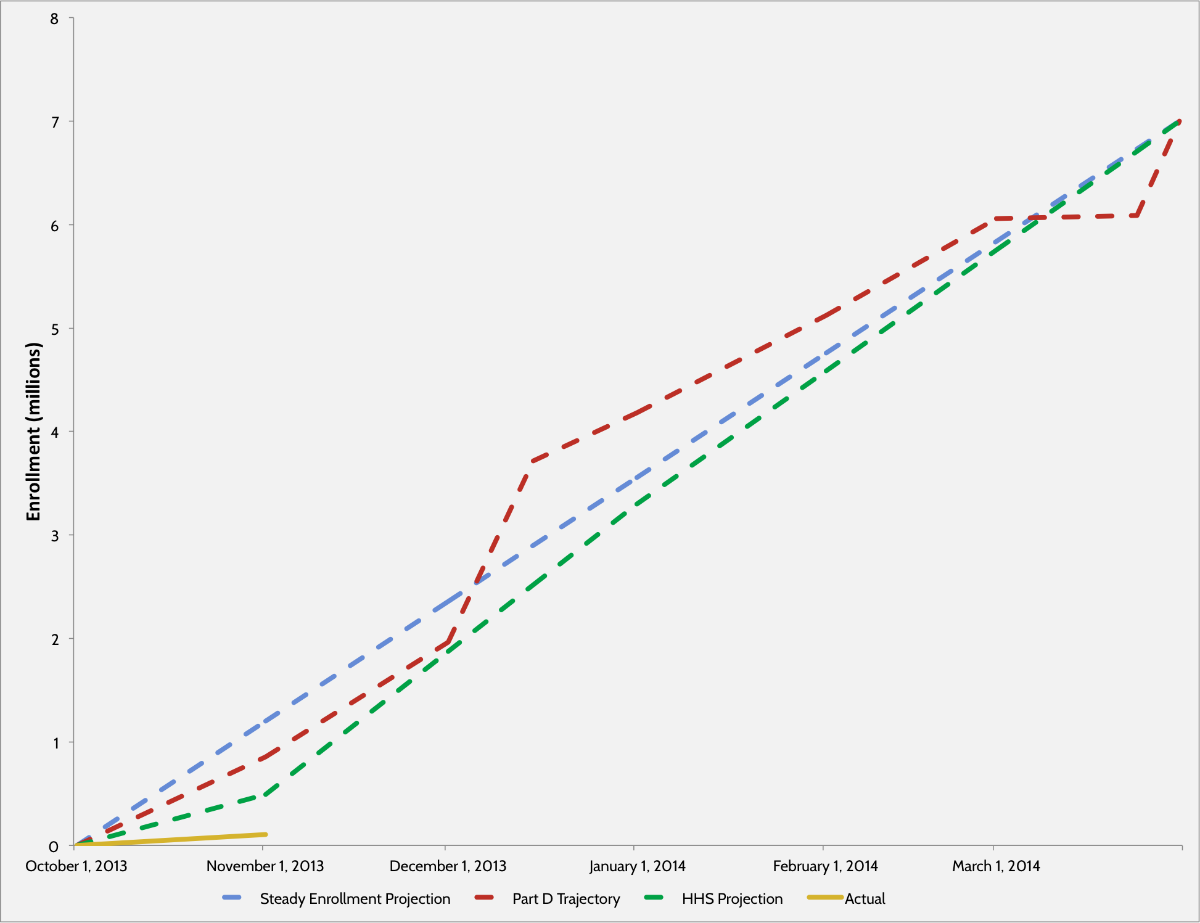 Enrollment in the Affordable Care Act Exchanges is far below what HHS Projected and where Medicare Part D was.