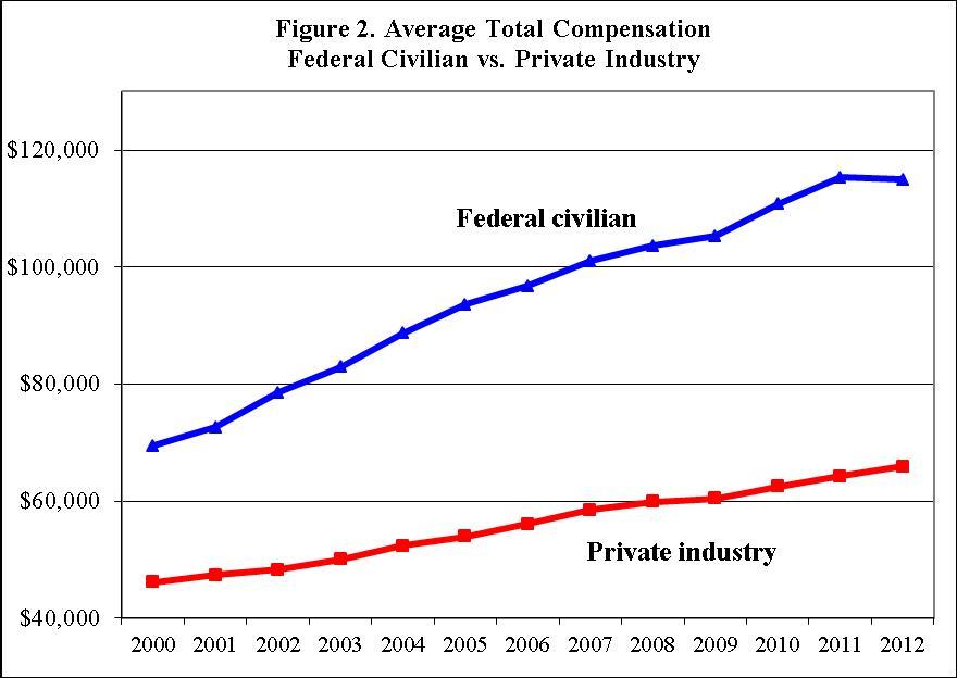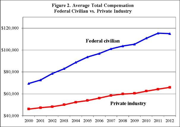 Compensation of federal employees has risen faster than compensation of private-sector employees during the last decade. Federal worker compensation averaged $114,976 by 2012, or 74 percent more than the $65,917 the private sector averaged.