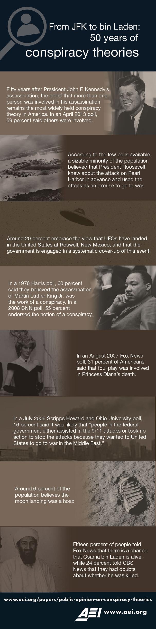 Fifty years after President John F. Kennedy’s assassination, the belief that more than one person was involved in his assassination remains the most widely held conspiracy theory in America. In an April 2013 poll, 59 percent said others were involved.