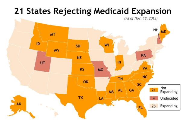 These 21 states have rejected the federally-funded expansion of Medicaid available under the Affordable Care Act. In these states, people who make under 138% of the poverty level won't have access to Medicaid - but they also don't get subsidies to buy health insurance on the exchanges.