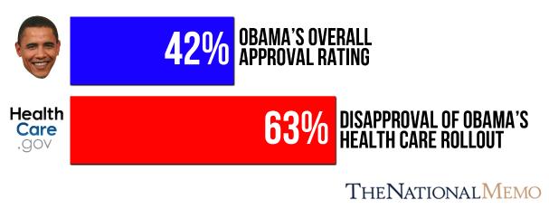 President Barack Obama’s approval rating has fallen sharply because of the botched launch of his signature health care plan, says a poll out Tuesday. His overall approval rating stands at 42% dropping six points in a month. Obama’s handling of the health care law’s rollout has a disapproval rating of 63%. Last month, 53% disapproved.