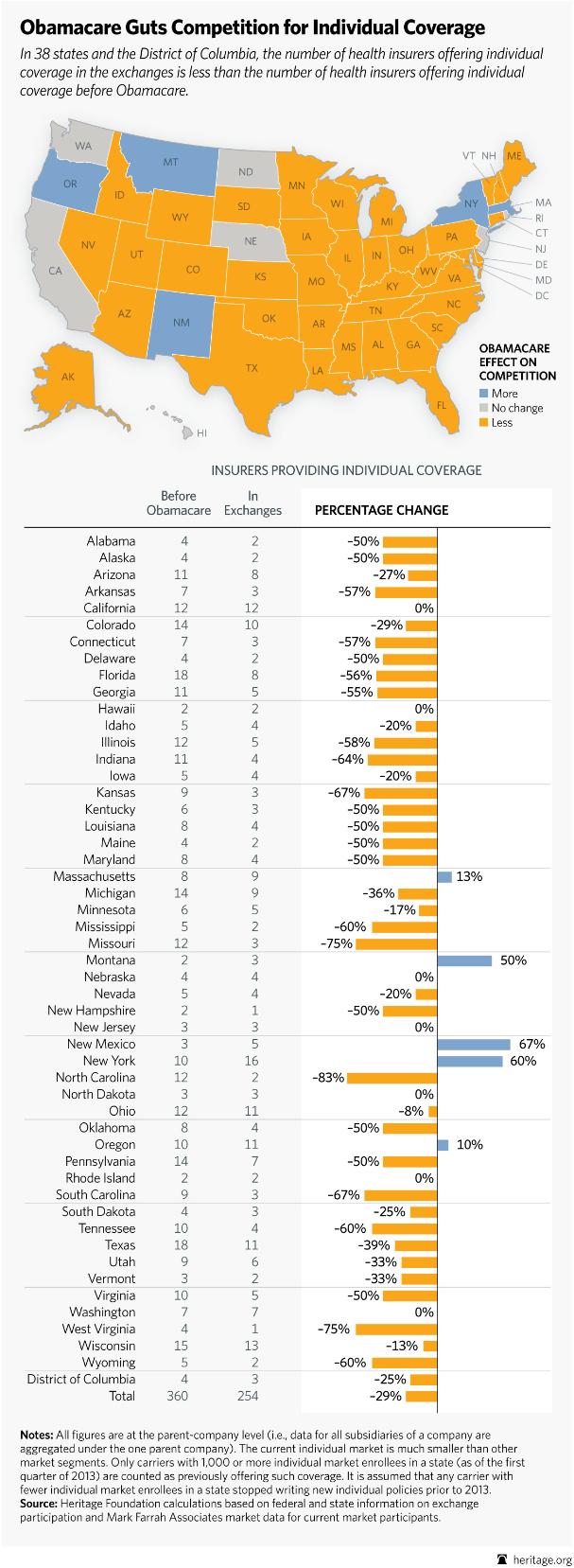 In 38 states and the District of Columbia, the number of health insurers offering individual coverage in the exchanges is less than the number of health insurers offering individual coverage before Obamacare.