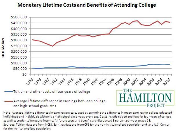 While college may be 50 percent more expensive now than it was 30 years ago, the increase to lifetime earnings that a college degree brings is 75 percent higher. In short, the cost of college is growing, but the benefits of college—and, by extension, the cost of not going to college—are growing even faster.