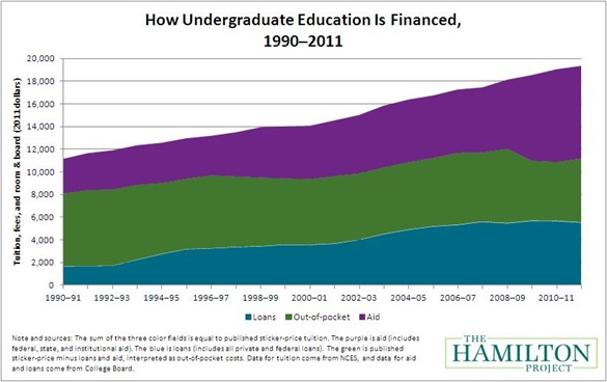 The graph shows that while the sticker price of tuition has increased steadily, the net cost—represented as the sum of the green and blue areas—has been relatively flat. It is evident that an increasing percentage of average net tuition is being financed by loans, even though net tuition has not increased much in magnitude over recent decades