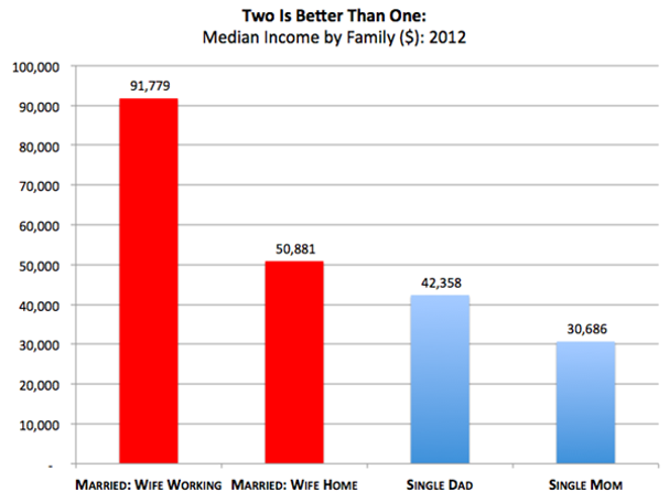 Marriage is becoming an affluent pursuit, and social mobility is stagnating: two big contemporary American problems. Having two earners is clearly better than having one. It used to be that a breadwinning male was "head" of the household. But two heads are better than one: households with two working spouses have an income three times that of a single mother.