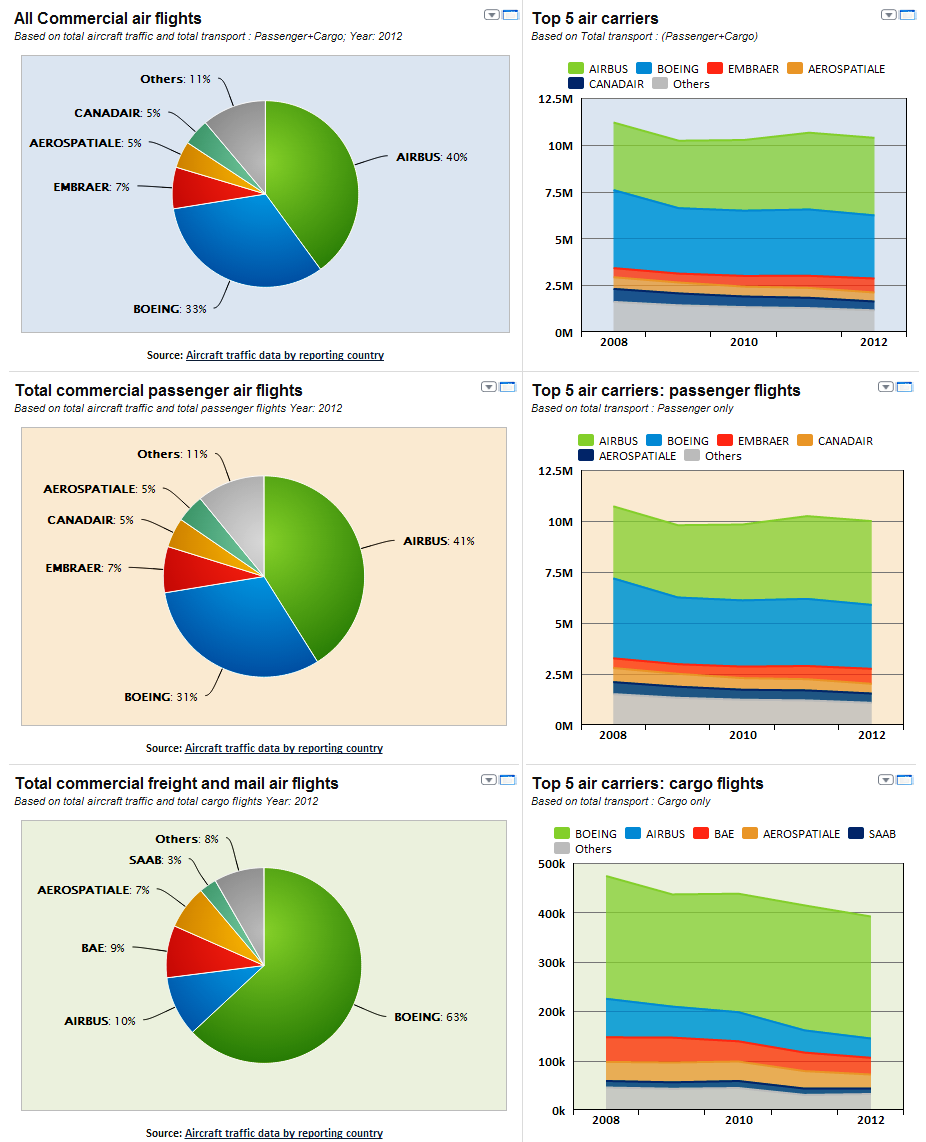 On an average Airbus continues to dominate the commercial air carrier segment of Europe, as per the 2012 statistics. In the passenger space, Airbus tops the list followed by Boeing and Embraer. However, Boeing maintains a clear lead in the cargo space, over other aircraft manufactures.