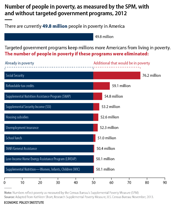 As the Economic Policy Institute illustrates, Social Security, the Earned Income Tax Credit, food stamps, housing subsidies — and many other items on the long list of safety net programs that Paul Ryan and Congressional Republicans has targeted for steep cuts in the past — kept millions of Americans out of poverty in 2012.