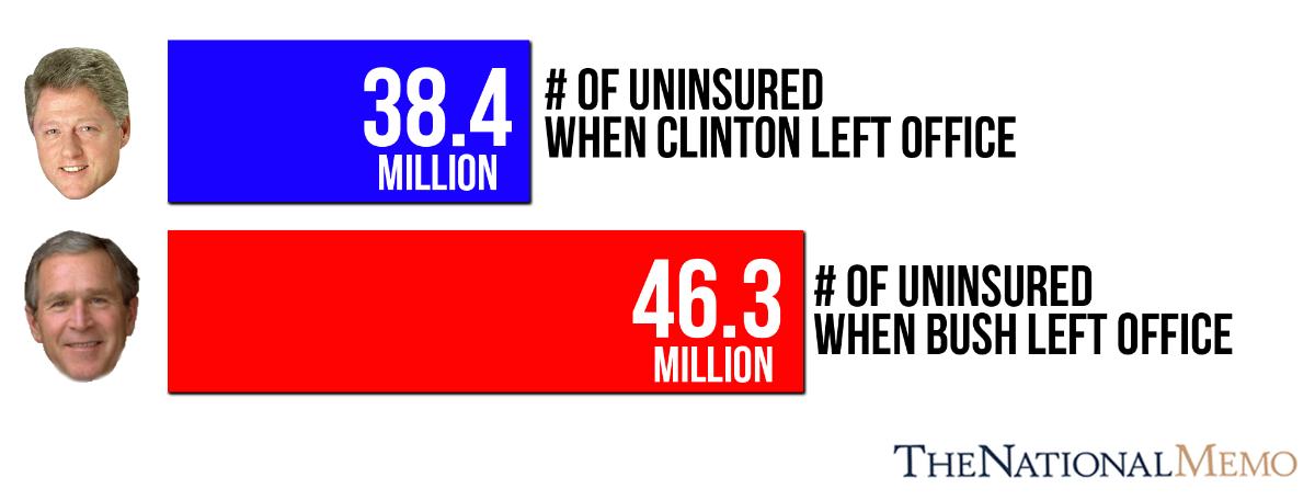 When former president Bill Clinton left office, the number of uninsured Americans stood at 38.4 million. By the time former president George W. Bush left office that number had grown to just over 46.3 million, an increase of nearly 8 million or 20.6 percent.