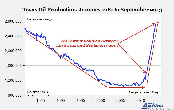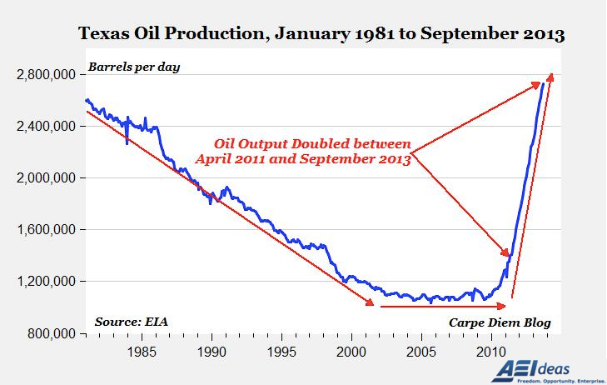 Oil output has doubled in only 29 months to a 33-year high in September according to new state crude oil production data released by the Energy Information Administration. The exponential increase in Texas oil output over roughly the last three years has completely reversed the previous, gradual 28-year decline in the state’s conventional oil production.