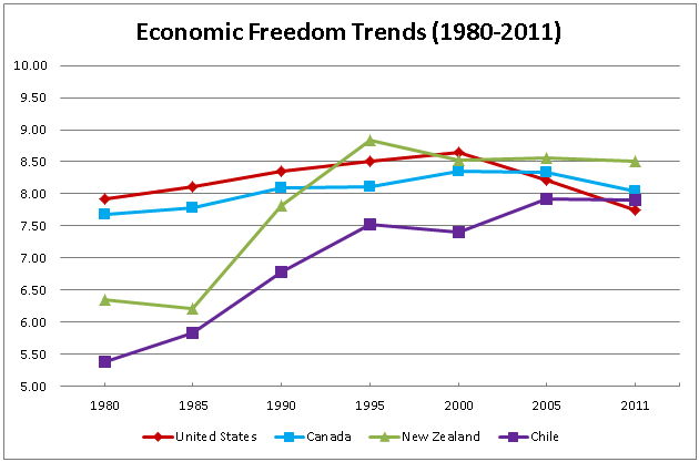 According to the "Economic Freedom of the World: 2013 Annual Report", the U.S. continues to lose economic freedom. The U.S. has seen more than a decade of decline in economic freedom, having been ranked 2nd on the freedom index in 2000, 8th in 2005 and now 17th in the current report. Meanwhile, economic freedom has been modestly increasing internationally.