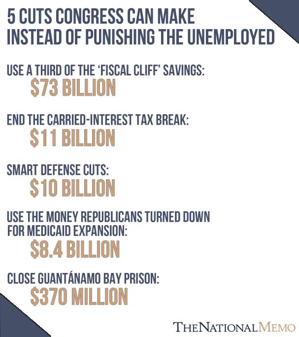 Congress is about to make a million of the nation’s most unfortunate citizens a little more unfortunate by simply doing nothing. At the end of this month 1.3 million people will lose their unemployment benefits as a federal program expires at a cost of $25 billion a year. Here's how they can make cuts without punishing those out of work.