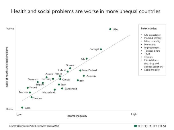 In rich countries, a smaller gap between rich and poor means a happier, healthier, and more successful population. Just look at the US, the UK, Portugal, and New Zealand in the top right of this graph, doing much worse than Japan, Sweden or Norway in the bottom left.