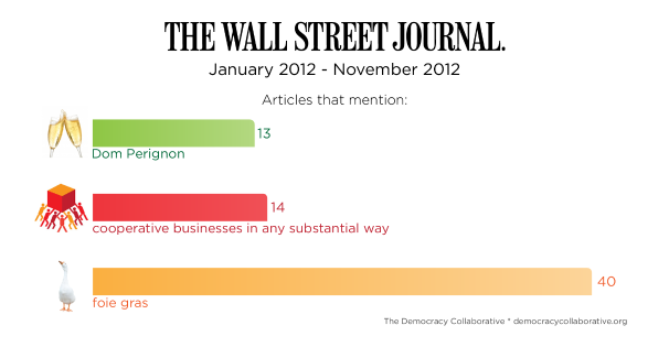 The vast number of cooperative businesses across the country were discussed in just 70 articles and a mere 14 gave co-op businesses more than passing mention. Together, the articles narrowly outnumbered the 13 Journal pieces that mentioned Dom Perignon over the same time frame, and were eclipsed by the 40 Journal entries that refer to the French delicacy foie gras.