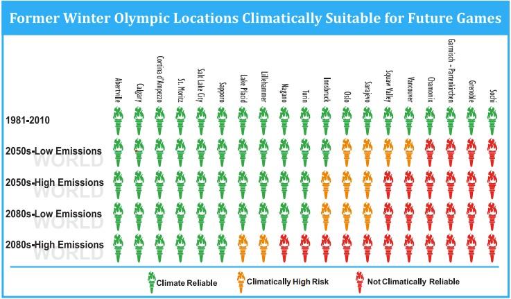 More than a dozen previous hosts of the Winter Olympics may be unable to host future games by the 2080's due to warming climates. This includes Sochi, whose climate is projected to be unsuitable in less than 50 years.