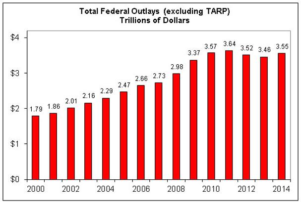The CBO released its new budget outlook today. The chart below shows total federal spending since 2000. Spending was way up under Bush and the first two years of Obama, and roughly flat since then.