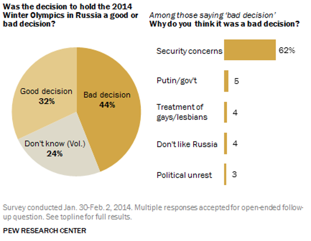 Nearly half (44%) of Americans said that the decision to host the 2014 Winter Olympic Games in Sochi, Russia was a bad idea. The vast majority of those who polled in the negative cited security concerns. The Volgograd bombings in December likely raised these fears in the lead-up to the Opening Ceremony.