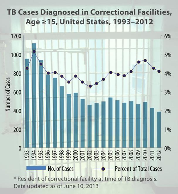 The number of tuberculosis cases reported in correctional facilities dropped 66 percent from 1994 to 2012. From a high of 1,117 cases in 1994, reported cases dropped to only 384 in 2012. Despite this drop, the percentage of total tuberculosis cases that correctional facilities account for has remained relatively stable at around 4 percent.