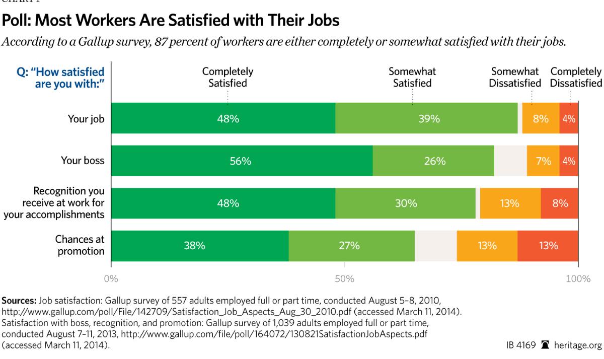 According to a Gallup survey, 87 percent of workers are either completely or somewhat satisfied with their jobs.