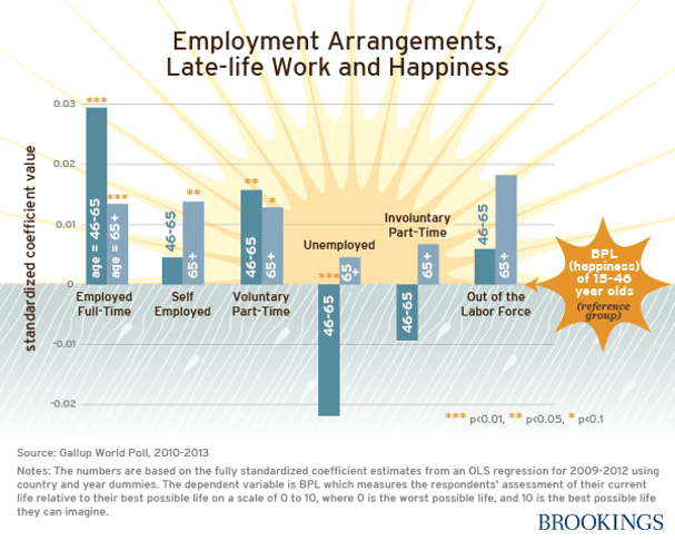 There is a “happiness premium” among older workers working full-time or voluntarily employed part-time. And late-life workers working full-time or voluntarily employed part-time are typically happier and more satisfied with their health than their retired counterparts.