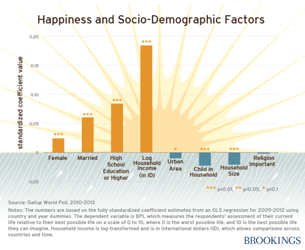 Income matters to individual happiness. Yet after basic needs are met, other things like how your income compares to that of your peers also start to matter. Married people are typically happier than their non-married counterparts; healthier people are happier; and women are, in most places, happier than men.