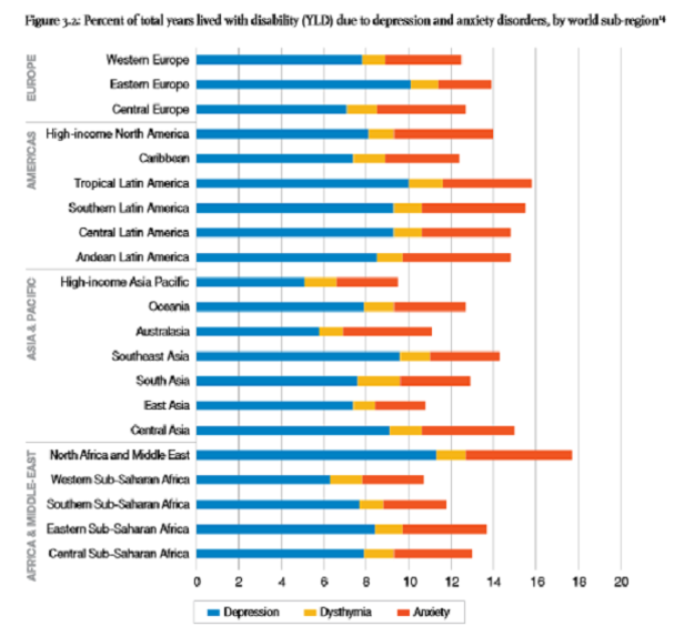 Across different regions of the world, depression and anxiety disorders alone account for 10-18% of all years lived with disability in those populations. The disability burden is highest in adolescence and young adulthood (20% among 15-19 year olds), falling steadily to 10% by the age of 60-64 years.