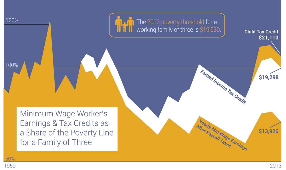 In 1997, the combination of the EITC and full- time minimum wage work was briefly enough to lift a family of three to the poverty level, fulfilling President Clinton’s pledge that “if you work, you shouldn’t be poor.” This package was immediately eroded by inflation and fell below the poverty line until the next minimum wage increase in 2007.