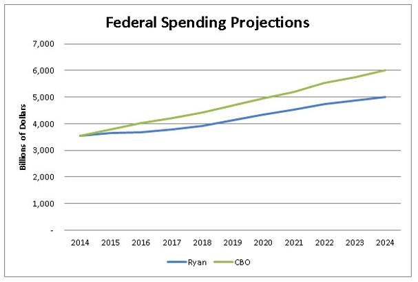 Chairman Paul Ryan’s budget supposedly cuts federal government spending by $5.1 trillion over the next ten years. However, this slash in spending is only observed when compared to the CBO baseline projections. In reality, Ryan’s budget would increase spending at an annual average rate of 3.5 percent, or from $3.54 trillion in 2014 to $5.0 trillion in 2024.