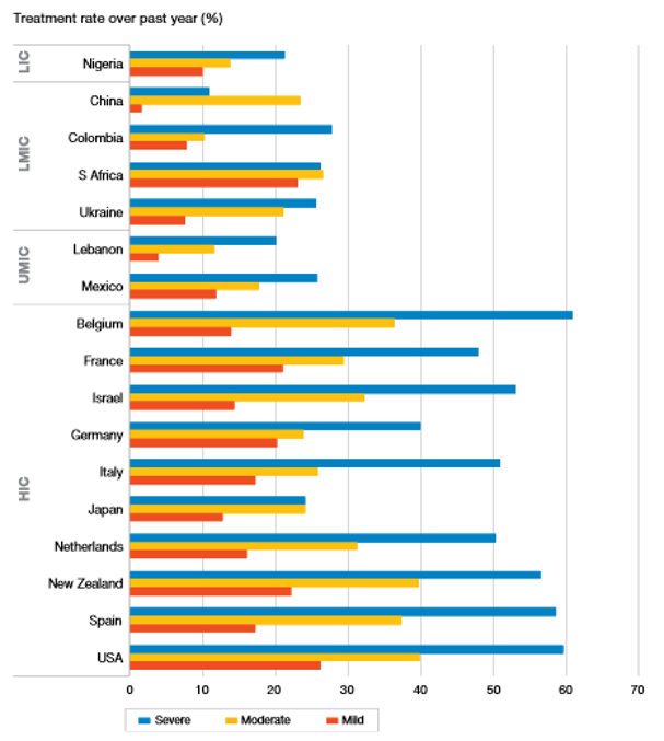 A key factor to the burden of mental disorders is the lack of appropriate treatment. Global estimates mask variations between different geographical or income settings. This chart reveals how low service rates are for mental and substance use disorders in low- and middle-income countries, even when the degree of disability or health loss is severe.