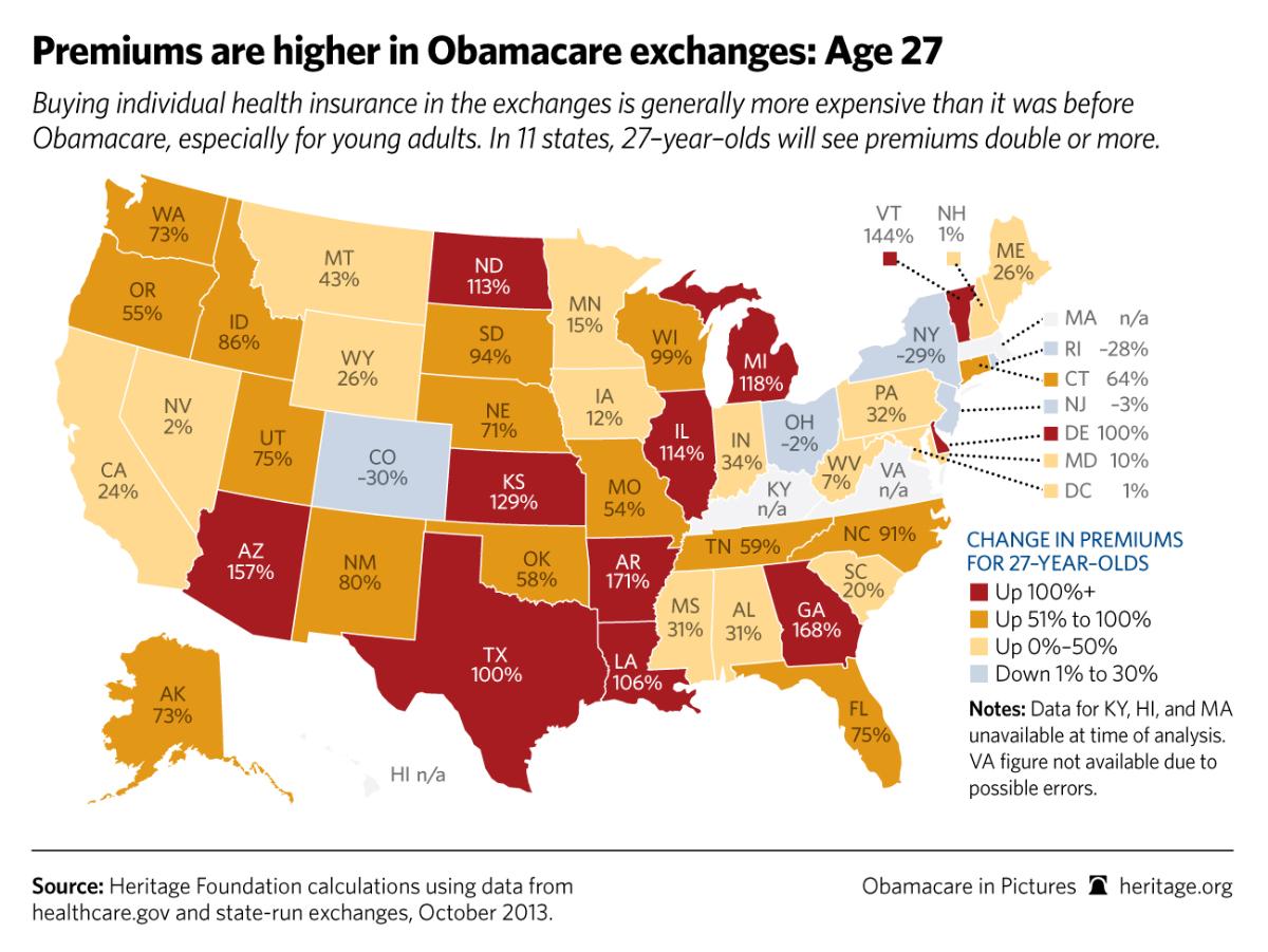 Buying individual health insurance in the Obamacare exchanges is generally more expensive than it was before Obamacare, especially for young adults. in 11 states, 27-year-olds will see their premiums double or more.