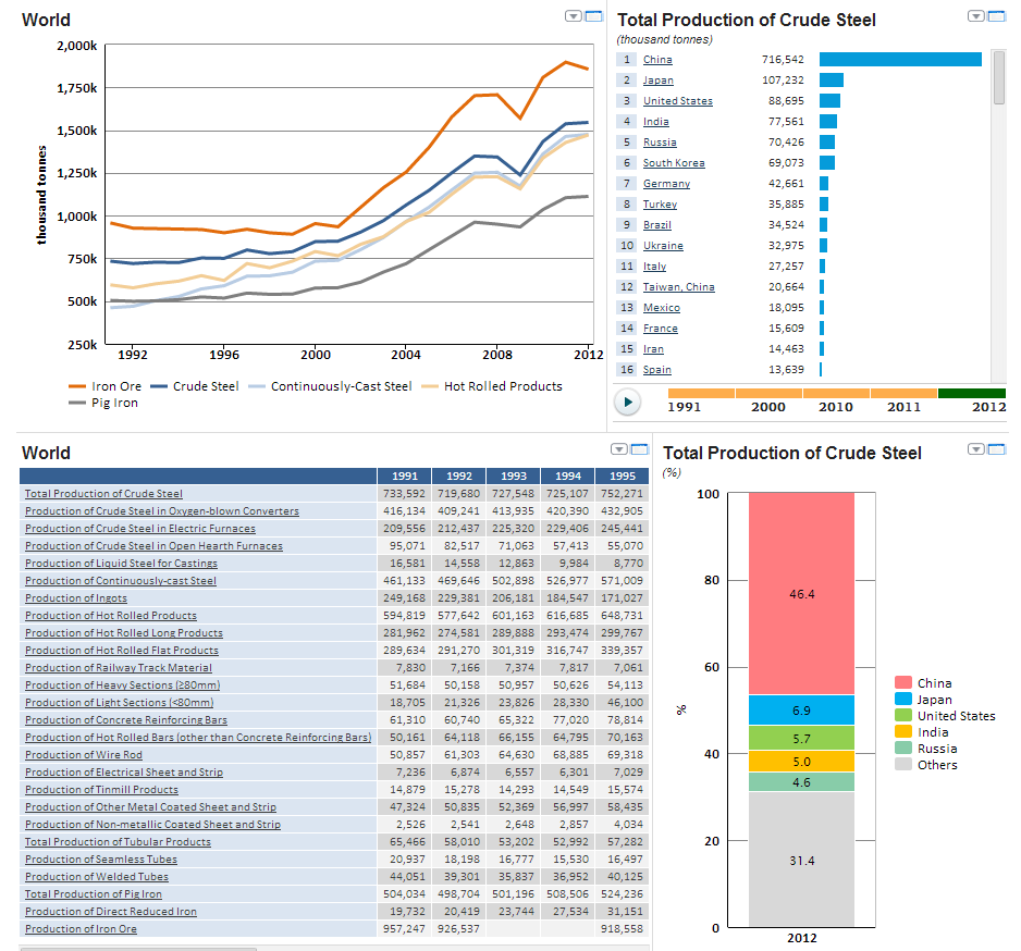As of 2012, 1,545 million tons of crude steel were produced in China being an absolute leader in world's crude steel production, according to the data provided by World Steel Association.