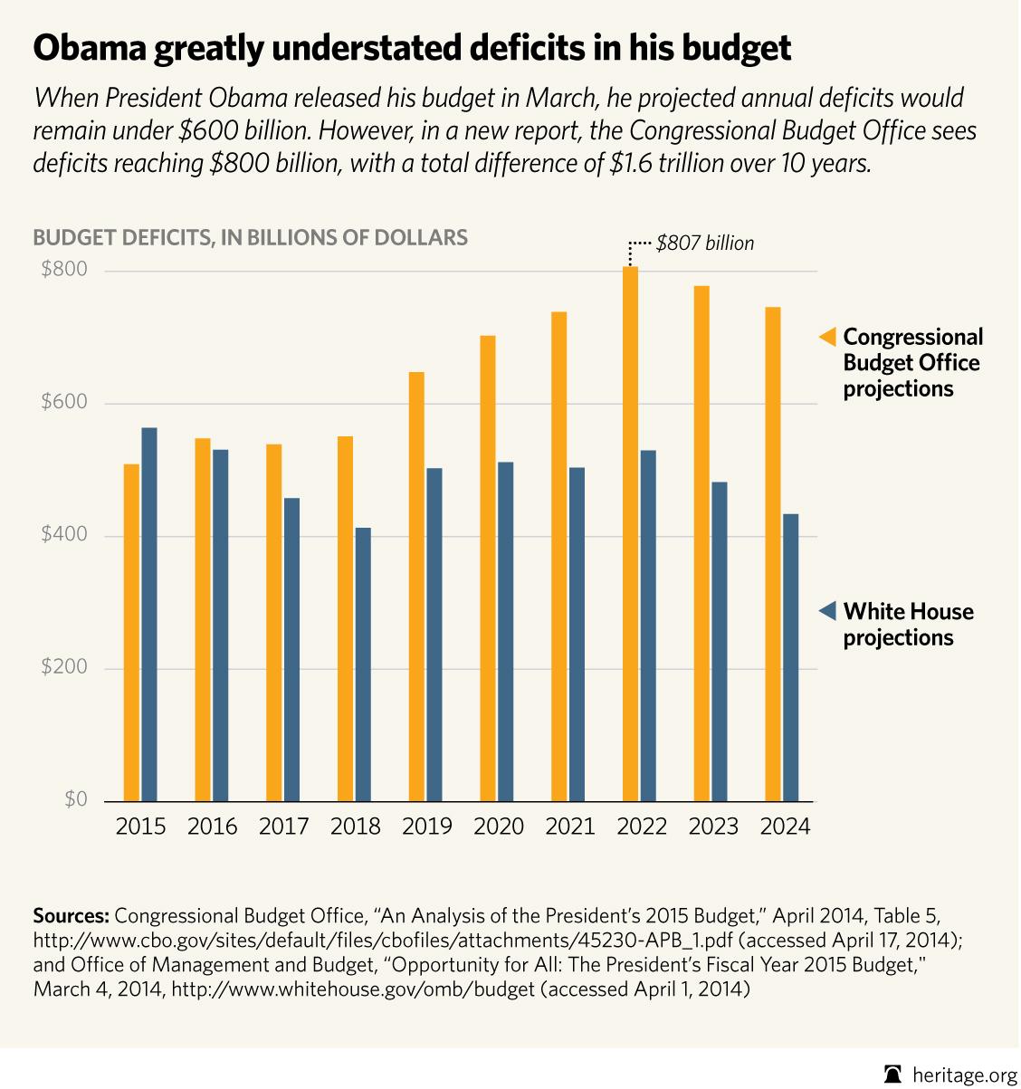 When President Obama released his budget in March, he projected annual deficits would remain under $600 billion. However, in a new report, the Congressional Budget Office sees deficits reaching $800 billion, with a total difference of $1.6 trillion over 10 years.