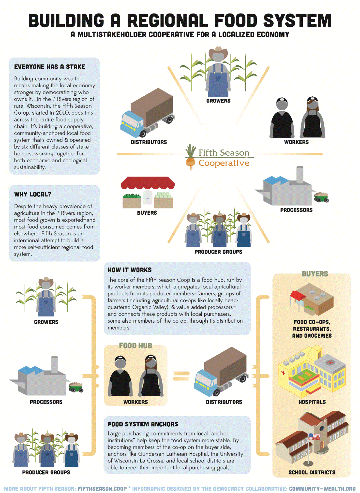In the 7 Rivers region of Wisconsin, the Fifth Season Co-op is strengthening the local economy by democratizing who owns it. This co-op is building a local food system to foster economic and ecological sustainability in a region where most agriculture is exported and most agriculture consumed comes from elsewhere.