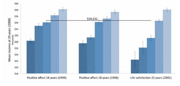 In line with the notion that happier workers are better workers, higher well-being is also shown to be associated with higher income and future income. Study results show that adolescents and young adults who report higher life satisfaction or positive affect grew up to earn significantly higher levels of income later in life. They used siblings as comparison controls.