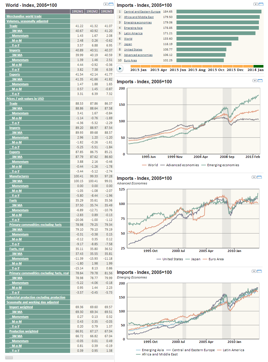 Explore global, regional and country-level monthly data on international trade and industrial production through the CPB World Trade Monitor (WTM) database visualized below. Provided by CPB (Central Planning Bureau) Netherlands Bureau for Economic Policy Analysis, WTM brings together, aggregates and summarizes monthly developments in trade and production at the earliest possible date.