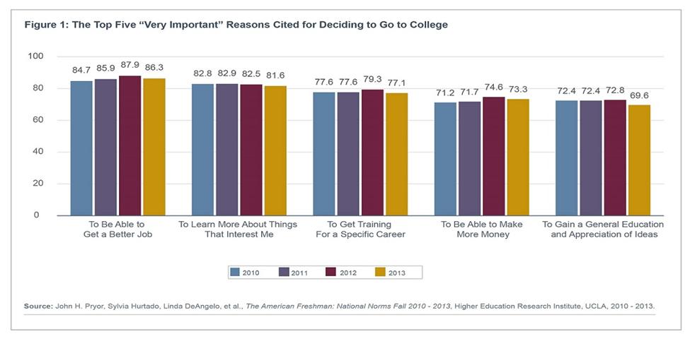 Research shows that consumers of postsecondary education and training are keenly interested in workforce results, such as post-graduation employment and earnings levels. In the annual Higher Education Research Institute (HERI) survey at four-year institutions, first-year students consistently report that their prospects for employment and improved earnings are very important to them as they enter college.