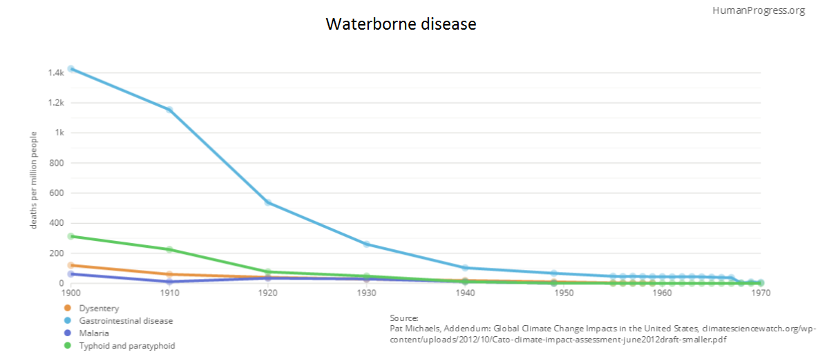 This chart shows the great decline of waterborne illnesses like typhoid and malaria in the past century. Contagious diseases that were once common are rare and cause far fewer deaths. That's why, when a small outbreak of measles makes national news, it's actually a testament to the human progress we have made in eradicating disease.