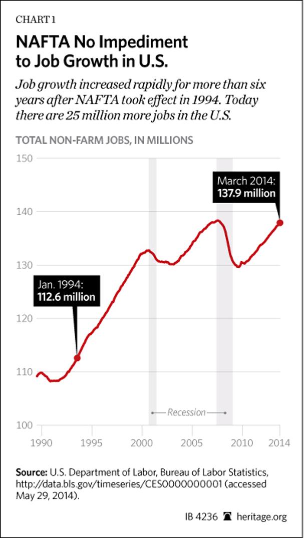 Job growth increased rapidly for more than six years after NAFTA took effect in 1994. Today there are 25 million more jobs in the U.S.