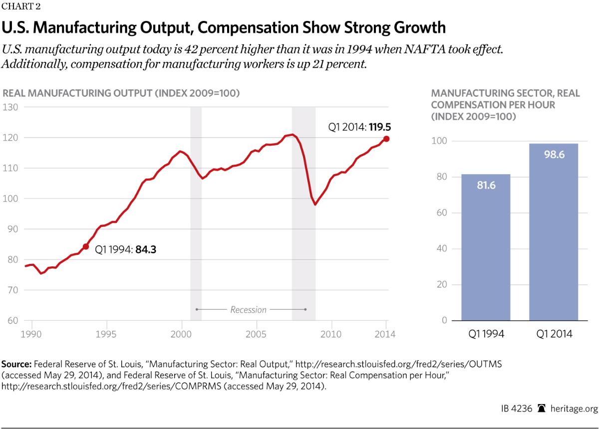 U.S. manufacturing output today is 42 percent higher than it was in 1994 when NAFTA took effect. Additionally, compensation for manufacturing workers is up 21 percent.