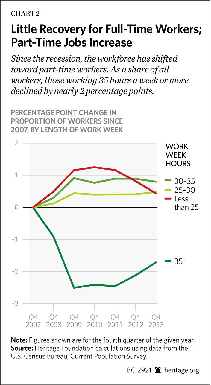 Since the recession, the workforce has shifted toward part-time workers. As a share of all workers, those working 35 hours a week or more declined by nearly 2 percentage points.